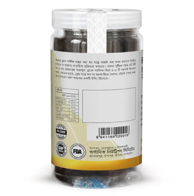এটি অর্গানিক নিউট্রিশন লিমিটেডের তৈরি, যা পুষ্টিগুণে ভরপুর। ব্ল্যাক গার্লিক সাধারণ রসুনের তুলনায় আরও শক্তিশালী অ্যান্টিঅক্সিডেন্ট সমৃদ্ধ এবং স্বাস্থ্যের জন্য অনেক উপকারে আসে। এটি রোগ প্রতিরোধ ক্ষমতা বাড়ায়, শরীরের বিষাক্ত পদার্থ দূর করে এবং কোষের ক্ষতি রোধ করে। নিয়মিত ব্ল্যাক গার্লিক খেলে হার্টের স্বাস্থ্য ভালো থাকে এবং কোলেস্টেরল নিয়ন্ত্রণে সহায়তা করে। এটি রক্তচাপ কমাতে সাহায্য করে এবং রক্ত সঞ্চালন উন্নত করে। ব্ল্যাক গার্লিকের অ্যান্টি-ইনফ্লেমেটরি গুণ শরীরের প্রদাহ কমাতে সাহায্য করে। এটি লিভারকে সুরক্ষা দেয় এবং হজম প্রক্রিয়া উন্নত করে। নিয়মিত গ্রহণে ত্বক উজ্জ্বল করে, বার্ধক্য রোধে সাহায্য করে এবং শক্তি ও সহনশক্তি বৃদ্ধি করে। এছাড়াও এটি ডায়াবেটিস নিয়ন্ত্রণে রাখতে এবং শরীরের রোগ প্রতিরোধ ক্ষমতা শক্তিশালী করতে সহায়তা করে।