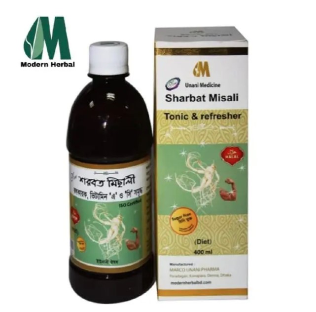Sharbat Misali 400ml Modern Herbal একটি হার্বাল (গাছ-ভিত্তিক) পণ্য, যা বাংলাদেশে বাজারে একটি সাধারণ শরবত / টনিক হিসেবে পাওয়া যায় এবং মূলত শারীরিক দুর্বলতা ও ভিটামিনের ঘাটতি দূর করতে ব্যবহৃত হয়।