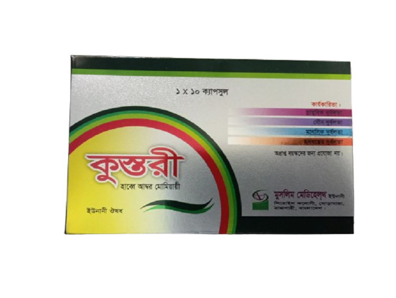 কুস্তুরি ক্যাপসুল মুসলিম মেডি হেলথের একটি ইউনানি হারবাল ওষুধ যা শরীরের শক্তি বৃদ্ধি ও দুর্বলতা দূর করতে ব্যবহৃত হয়। এটি বিশেষভাবে পুরুষদের স্বাস্থ্য উন্নয়নে সহায়ক হিসেবে পরিচিত এবং দেহের স্বাভাবিক কর্মক্ষমতা বাড়াতে সাহায্য করে এই ক্যাপসুলে বিভিন্ন প্রাকৃতিক ও ইউনানি উপাদান থাকে যা শরীরকে ভেতর থেকে শক্তিশালী করে এবং ক্লান্তি, অবসাদ ও নার্ভের দুর্বলতা কমাতে সহায়তা করে। নিয়মিত সেবনে এটি যৌন শক্তি বৃদ্ধিতে সহায়ক হতে পারে এবং স্ট্যামিনা বাড়াতে সাহায্য করে এটি রক্ত সঞ্চালন উন্নত করতে সাহায্য করে এবং মানসিক চাপ কমিয়ে শরীরকে সতেজ রাখতে ভূমিকা রাখে। পাশাপাশি শরীরের রোগ প্রতিরোধ ক্ষমতা বাড়াতেও সহায়ক হিসেবে কাজ করে সাধারণত প্রাপ্তবয়স্কদের জন্য দিনে ১ থেকে ২টি ক্যাপসুল খাবারের পর সেবন করা হয় তবে ব্যক্তির শারীরিক অবস্থা অনুযায়ী ডোজ পরিবর্তিত হতে পারে তাই অভিজ্ঞ ডাক্তার বা ইউনানি বিশেষজ্ঞের পরামর্শ অনুযায়ী সেবন করা উচিত